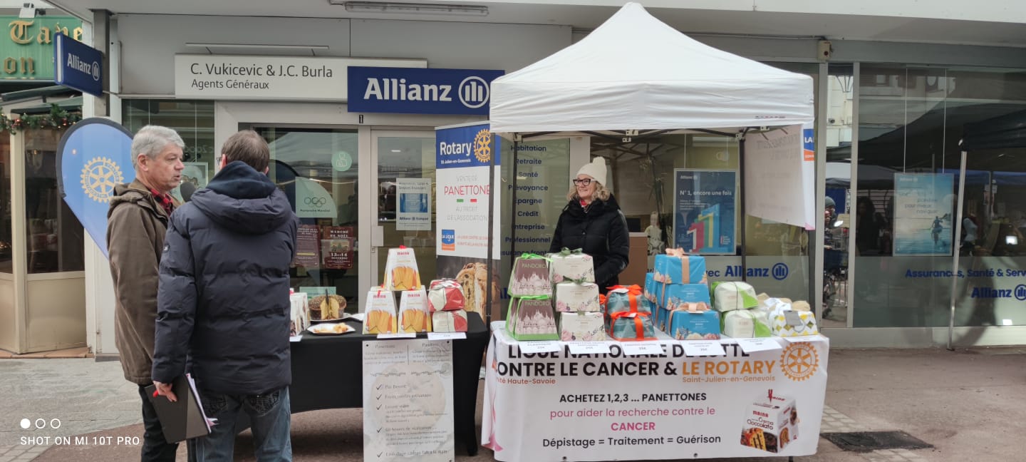 Suite au succès des 2 années précédentes, nous avons reconduit notre action de vente de panettones, directement importés d'Italie, et dont les bénéfices seront cette année encore attribués à La ligue contre le cancer de Haute Savoie. Merci aux bénévoles qui se sont relayés sur notre stand lors du Marché de Noël de Saint-Julien-en-Genevois les 13 et 14 décembre (malgré le froid et le temps très nuageux). La vente continue vendredi 19 et samedi 20 décembre à Carrefour Provencia.