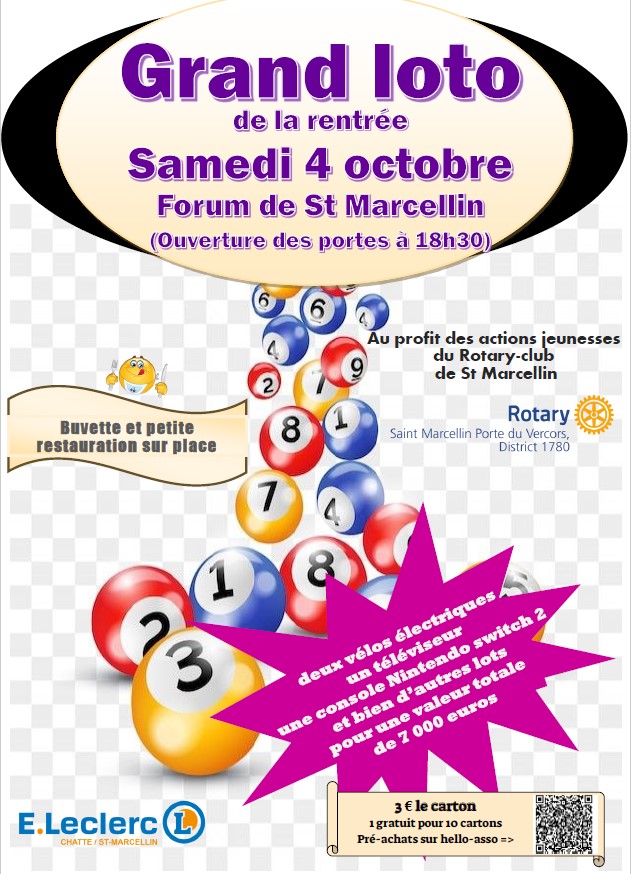 Samedi 4 octobre au Forum de Saint-Marcellin le Rotary-Club de Saint-Marcellin Portes du Vercors organise un grand loto au profit des actions jeunesses. Pour rappel, les clubs Rotary proposent aux jeunes, âgés de 16 à 18 ans, enfant de rotarien ou non, un séjour d’un an à l’étranger, leur permettant ainsi de se perfectionner en langue, de s’ouvrir au monde extérieur et de découvrir d’autres cultures.